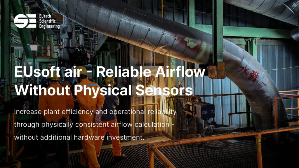 Instead of adding more hardware, the airflow can be reconstructed purely by physics-based modeling: EUsoft air solves the complete air path as an interconnected physical system. Based on the known plant topology, mass conservation, pressure-flow relationships, and fan characteristics, a physics-based model calculates the absolute airflow in real time. Existing measurements are continuously reconciled into a physically consistent system state.